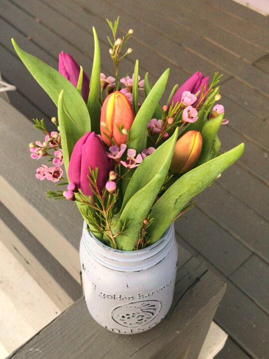 Tulips! A sweet mini jar with some tulips and fillers! Colours will vary, please specify colour choice if specific. Add $5 for painted jar.
