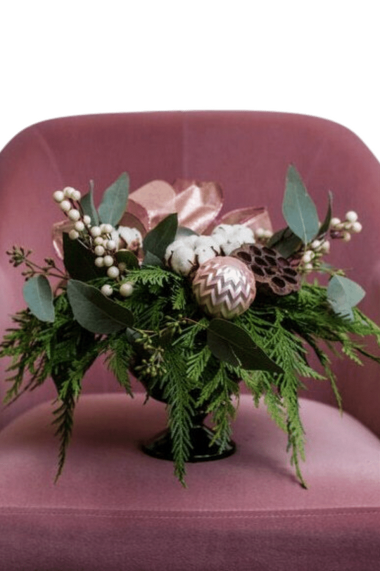 Experience the blush beauty of this festive arrangement, long-lasting and adorned with cotton and lotus pod for a natural, earthy feel.