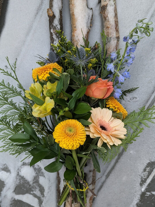 A lovely bouquet with rolled leaves, grasses, and fresh springy flowers. Spot the little hummingbird! Comes with a mini card for your personal message.