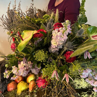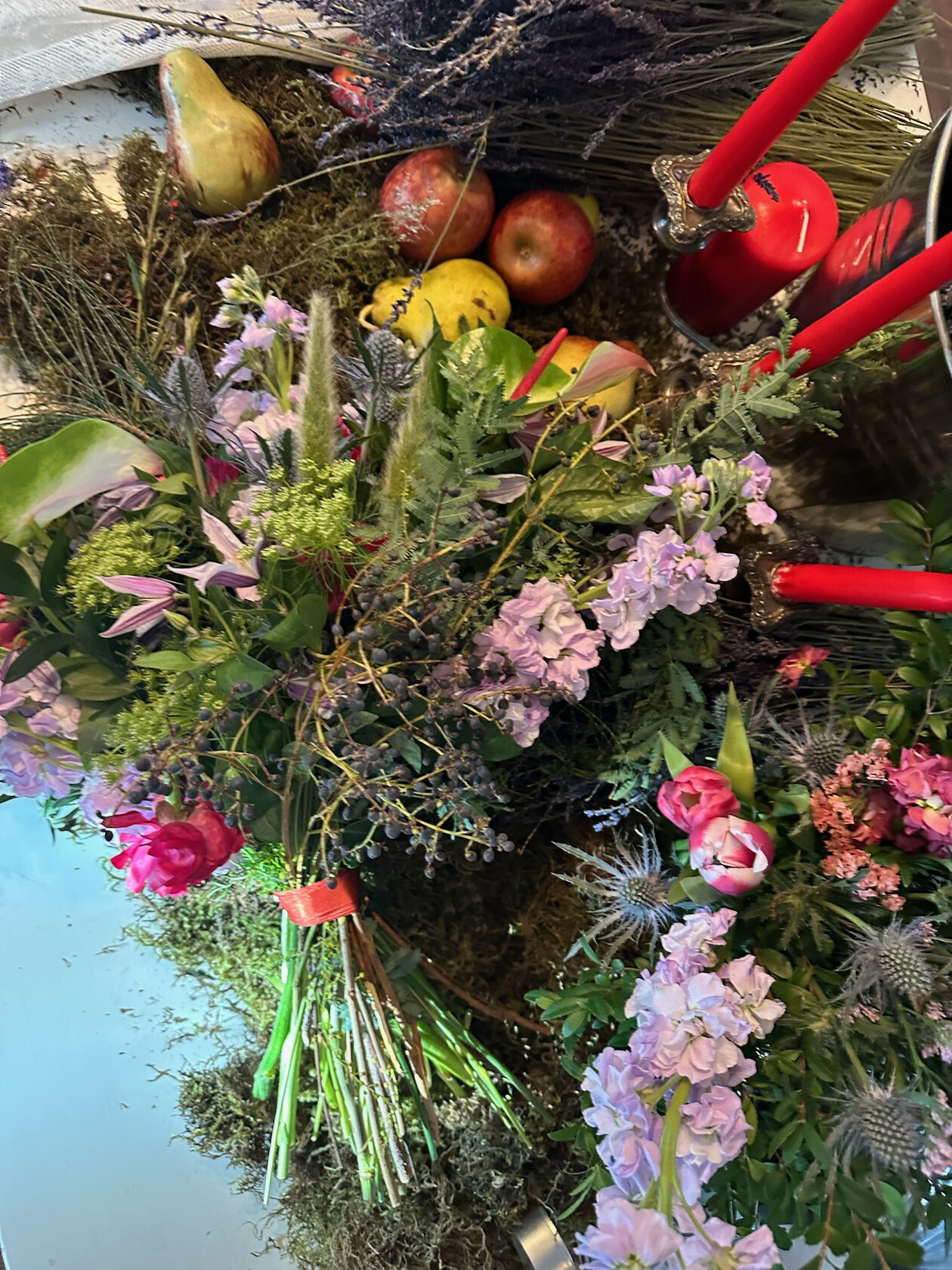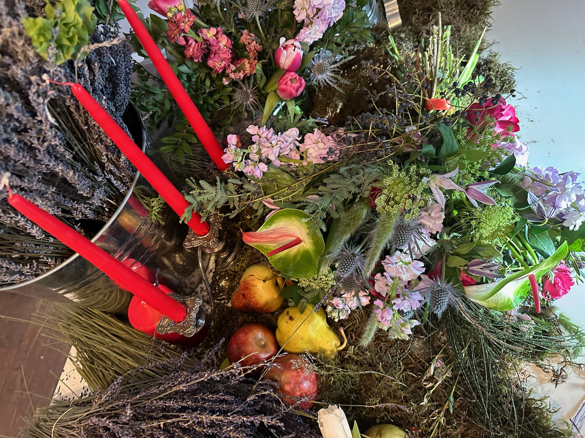 A wedding floral arrangement featuring garden-style blooms, berries, herbs, moss, and fruit, styled with red taper candles and rich organic textures. Designed around a farm-to-aisle wedding aesthetic, this piece blends wild florals with tactile elements, accented by anthurium with Paloma Pink speckles to create sculptural, architectural silhouettes. Perfect for couples drawn to colourful, natural, and beautifully unconventional wedding styling.
