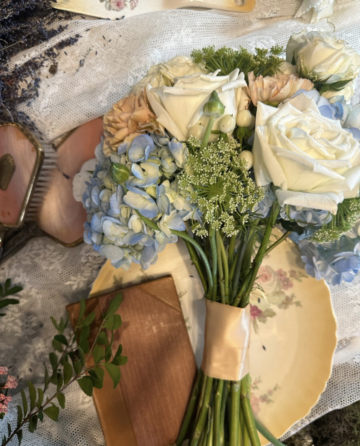 A romantic wedding bouquet featuring powder blue hydrangea, ivory roses, blush toned blooms, and delicate greenery, styled with vintage china, lace textures, and soft pastel accents. This design reflects a refined wedding colour theme that blends classic elegance with gentle movement and texture.