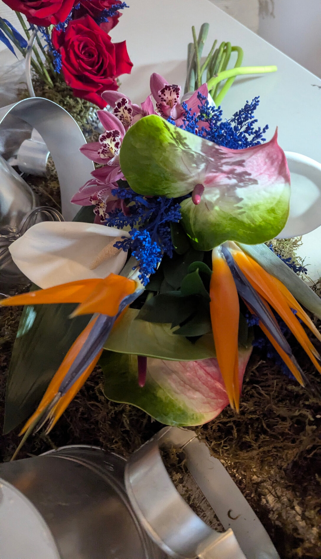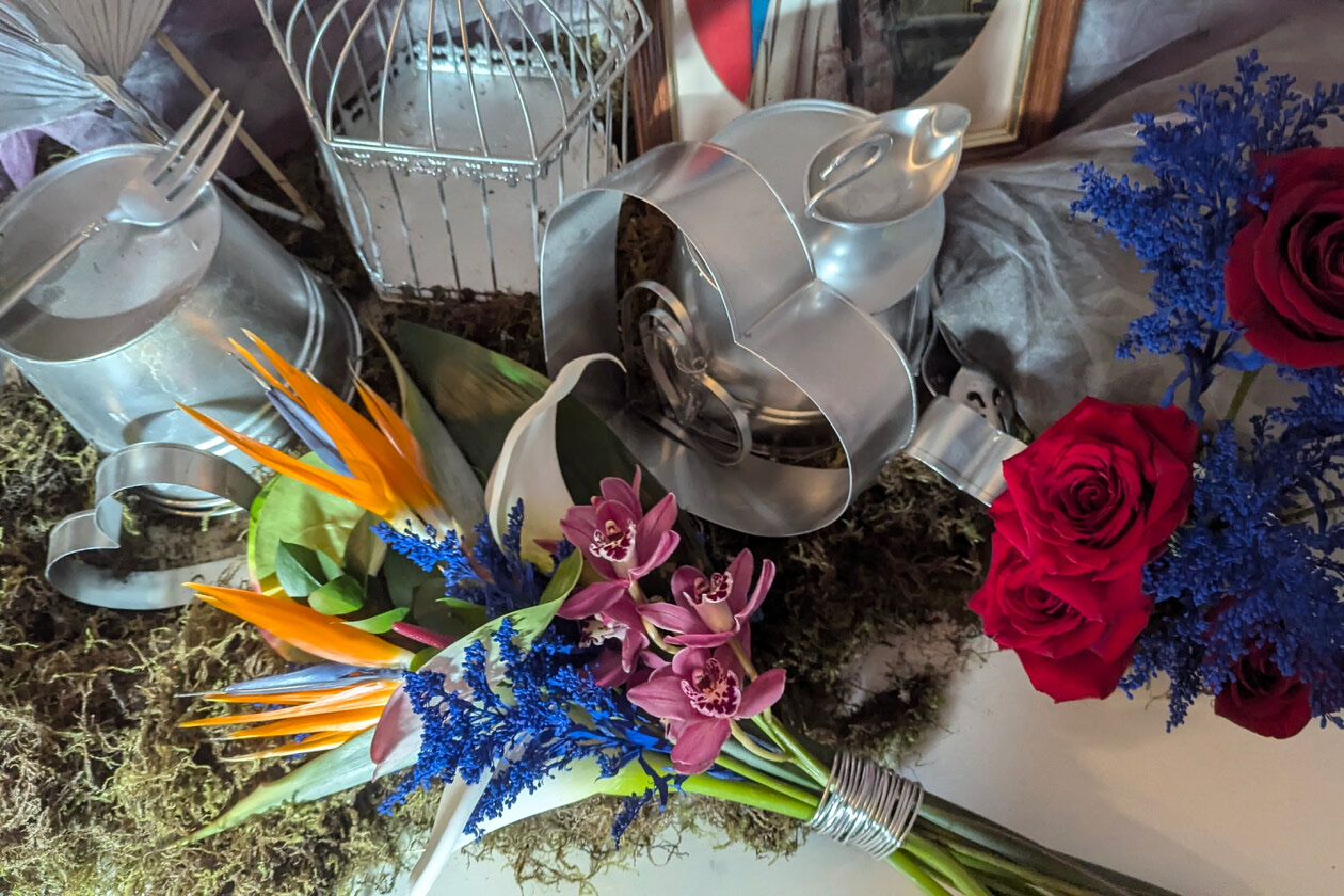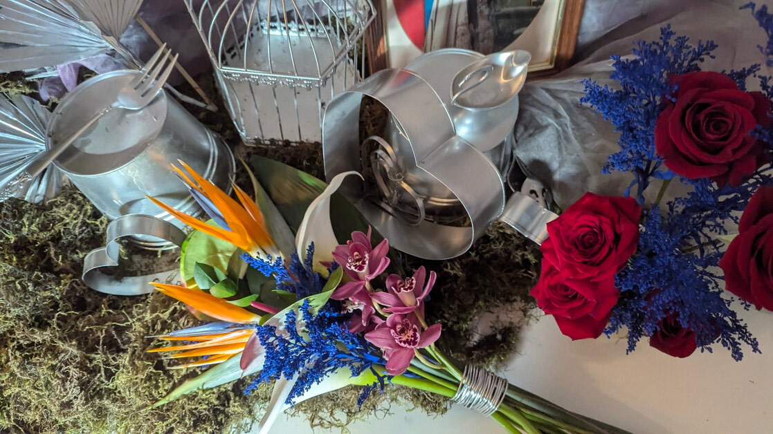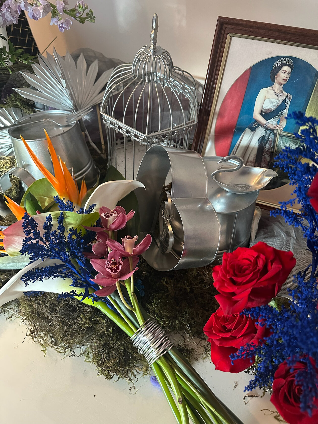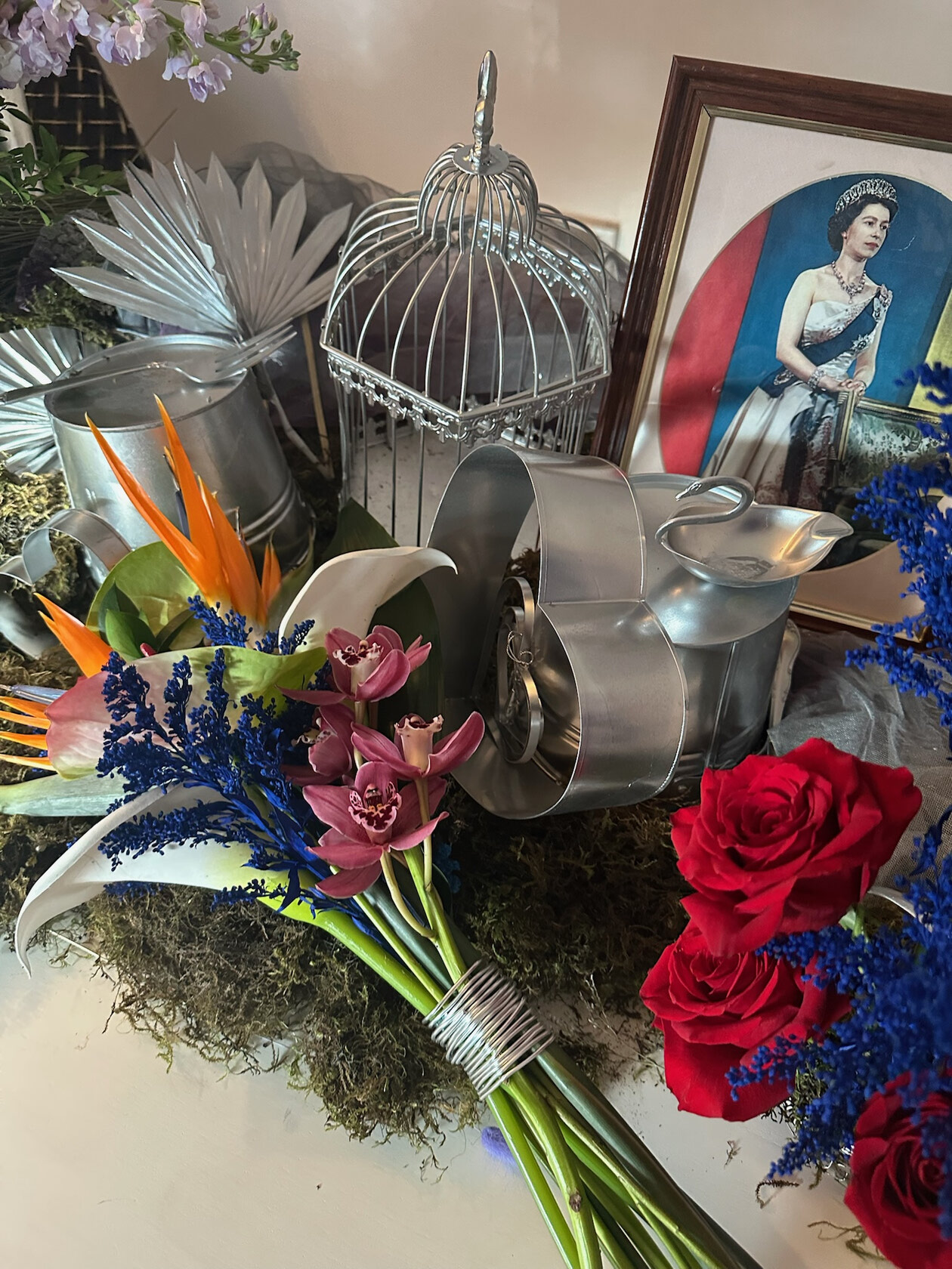wedding bouquet featuring cobalt blue accents, sculptural orchids, bird of paradise, and exposed stems, styled with cool metallic vessels and vintage-inspired decor. This arrangement highlights a bold yet refined wedding colour theme, blending modern structure with romantic texture for couples seeking unique and colourful wedding inspiration.