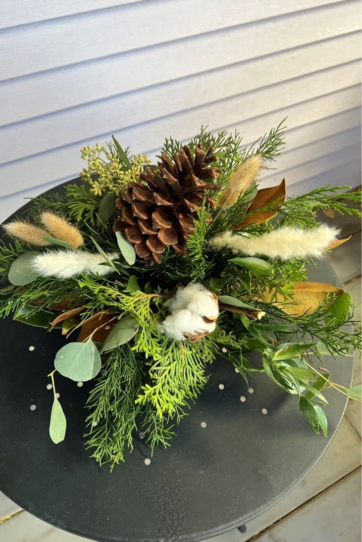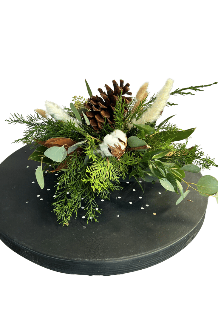 Evergreens, cotton, greenery textures and a BC ponderosa pine cone. It's a great way to bring some life to your dinner table throughout the season.