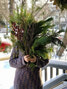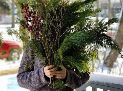 Create your own vase of evergreens for inside or a planter-style arrangement. Here is all you will need! BC Greenery, Red Huck branches and artificial berries that won't freeze outside