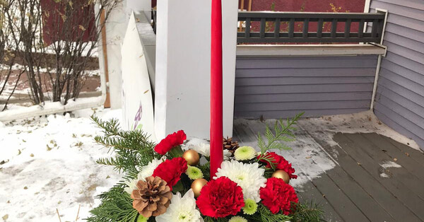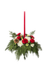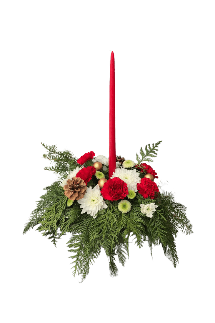 Traditional long-lasting flowers with Christmas bobbles and a candle to finish it off.
