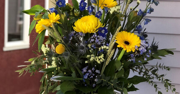 Inspired by golden fields and prairie skies, Alberta Harvest brings the beauty of the season to your space. This striking arrangement features bright yellow blooms paired with vivid blues and textured greenery, evoking the warmth of wheat fields and the depth of Alberta’s open skies.