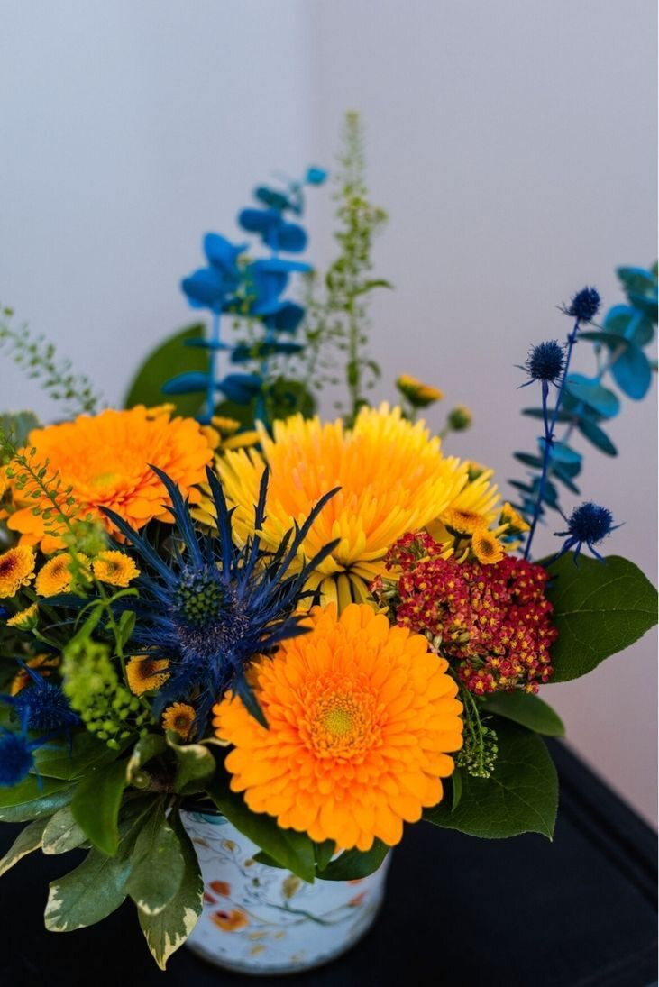 These vintage pots burst with apricot and blue tones, offering a long-lasting and eye-catching gift. Just add water to enjoy its enduring beauty.