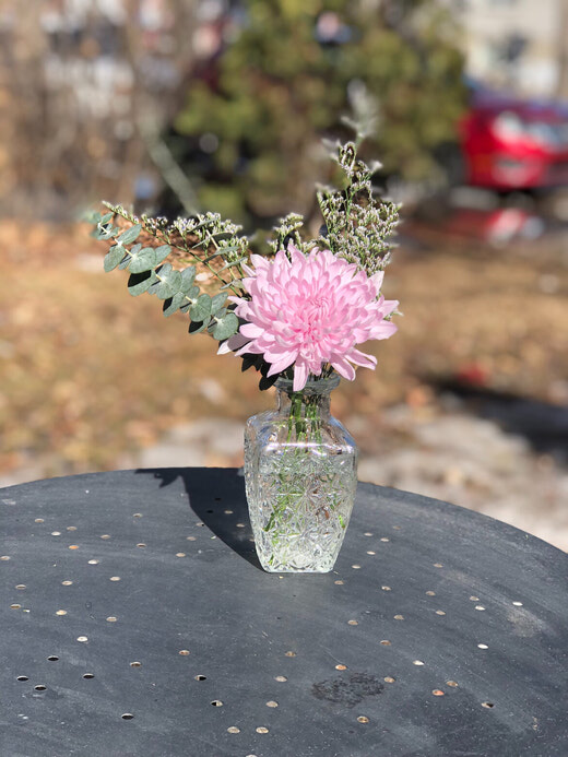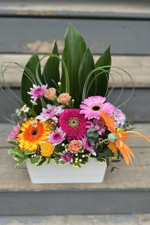 Please note that due to high volumes, this arrangement will look a little different. Smaller vase with some seasonal blooms such as pomponi mini gerbera daisy, waxflower and carnations to keep it nice and long lasting.