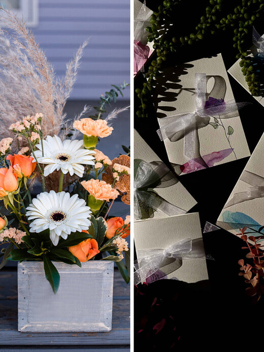 Simple branches and flower accents placed together bring a modern touch with pops of colour.