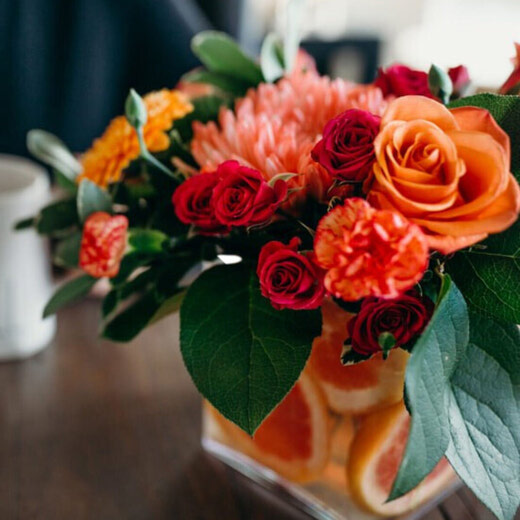 Built inside a beautiful fish bowl, each bowl might look a little different, created with gorgeous seasonal blooms, including hydrangea, roses, and orchids. Modern and low, this arrangement should be nice and long-lasting.