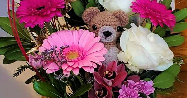Send a cozy bear hug with this arrangement, featuring a charming assortment of flowers accompanied by a little bear.