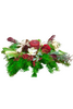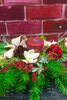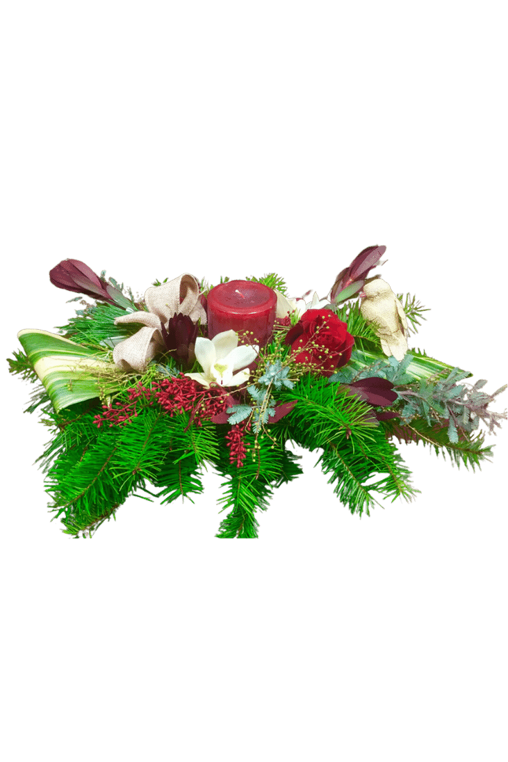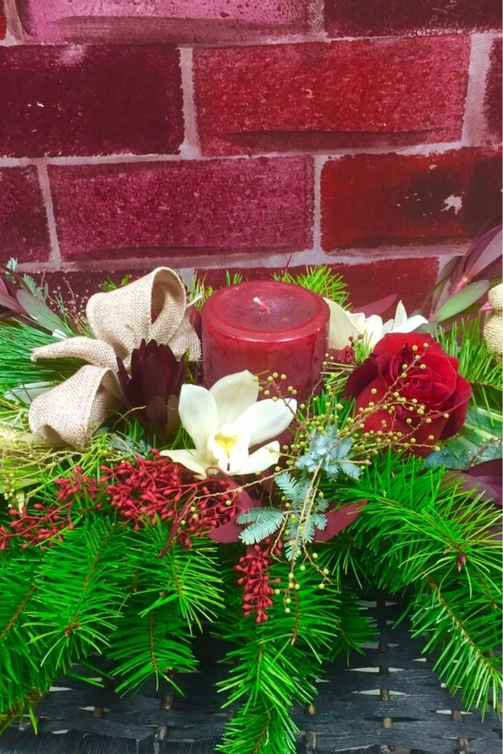 This rustic and charming centrepiece is accented with burlap, featuring roses, orchids, leucadendron, and fragrant evergreens, perfect for a cozy holiday setting.