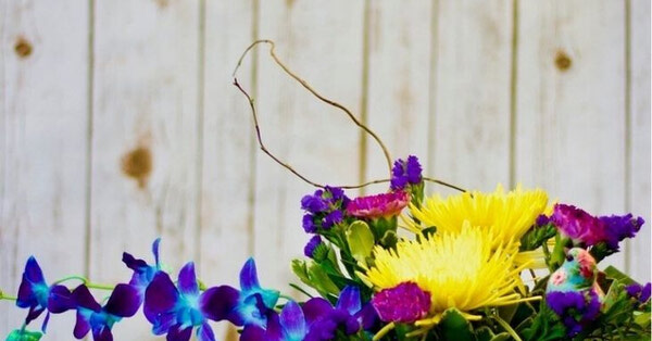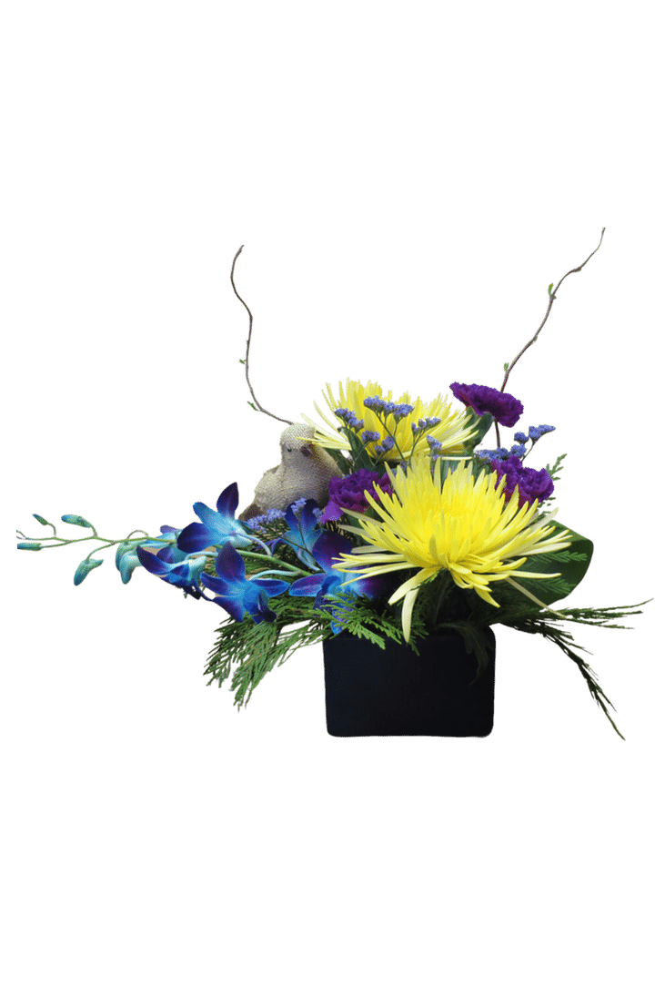 This cute little arrangement will add a bright spot to any room with its vibrant colours and the small bird ornament.