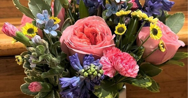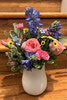 A cheerful little spring pot filled with vibrant pinks and blues—perfect for adding a pop of colour to any space.