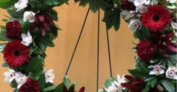 A heartfelt tribute crafted with rich burgundy blooms and soft blush accents, this standing wreath offers a graceful expression of love and remembrance. Designed with care, it features a blend of gerbera daisies, carnations, orchids, and lush greenery, symbolizing beauty, strength, and peace. A meaningful way to honour a loved one and offer comfort to those grieving.