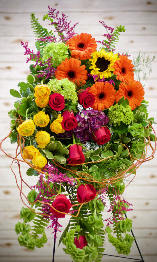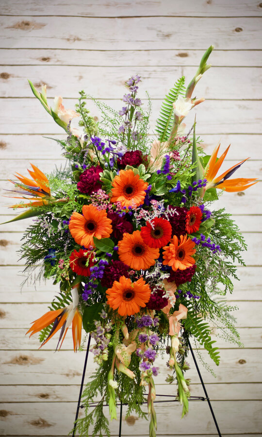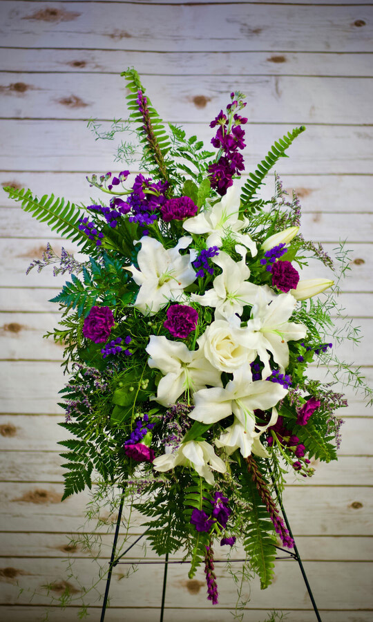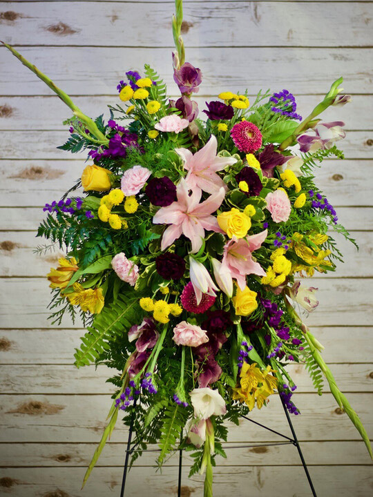 Large standing spray with a lovely assortments of pinks and purples.
