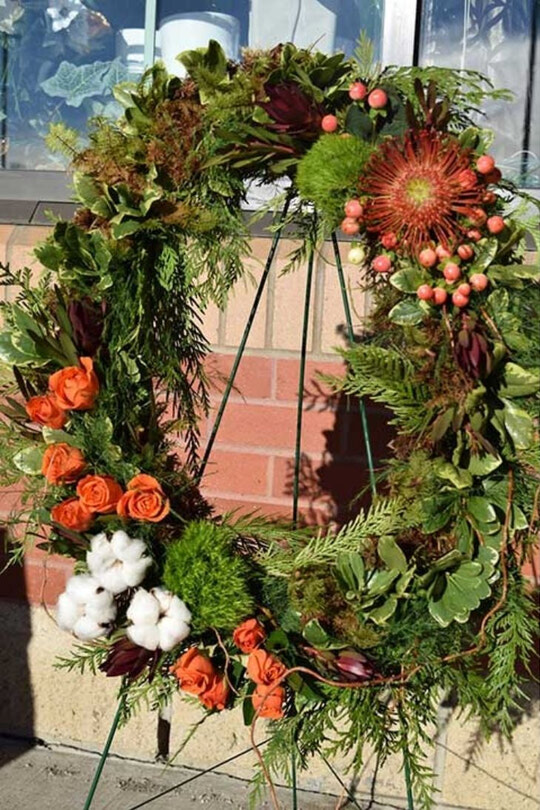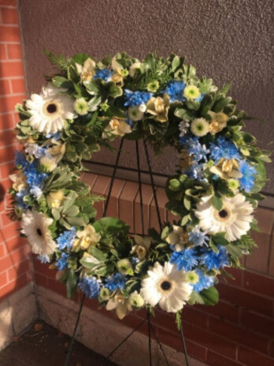 This 15" wreath featuring yellows and burnt orange is a lovely bright wreath for a celebration of life. Specify a colour theme and we can customize it for you.