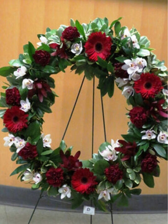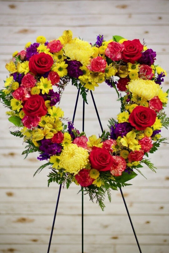 A heart wreath with a lovely assortment of flowers. Like a warm embrace. Comes with stand.