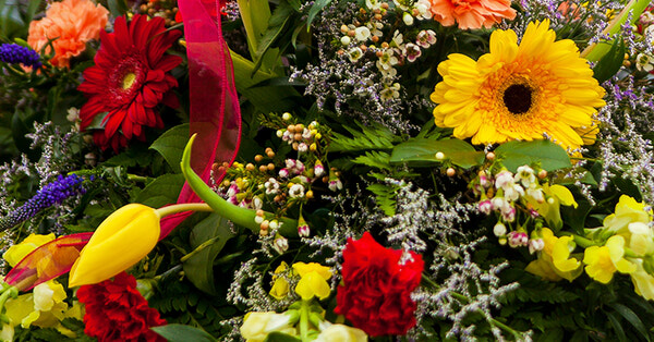 Larger spray with bright colours of spring flowers for placing on the casket, can customize colours.