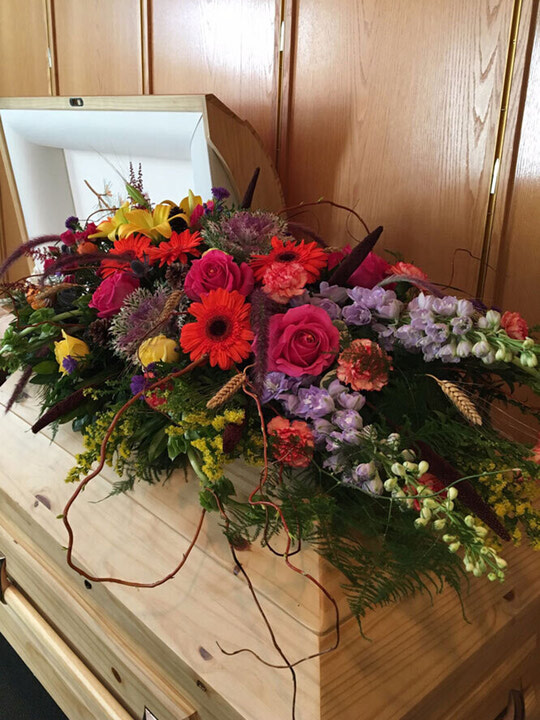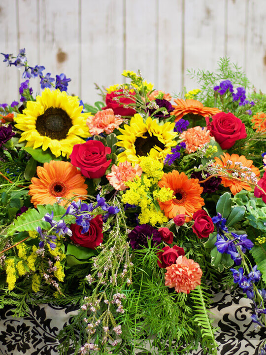 This casket spray speaks volumes about the person it pays tribute to. Colourful flowers and natural textures combine to create a big impression and are the perfect way to remember someone special.