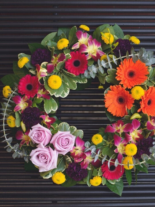 This wreath exudes comfort with its soft palette of cream gerberas and cymbidium orchids, complemented by BC chrysanthemums and colourful daisies, creating a serene and comforting tribute.