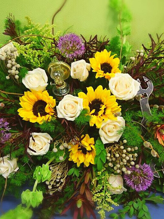 This lovely rustic arrangement is perfect for the memorial of an avid gardener or an antique collector. *Memorial Items were provided by family.