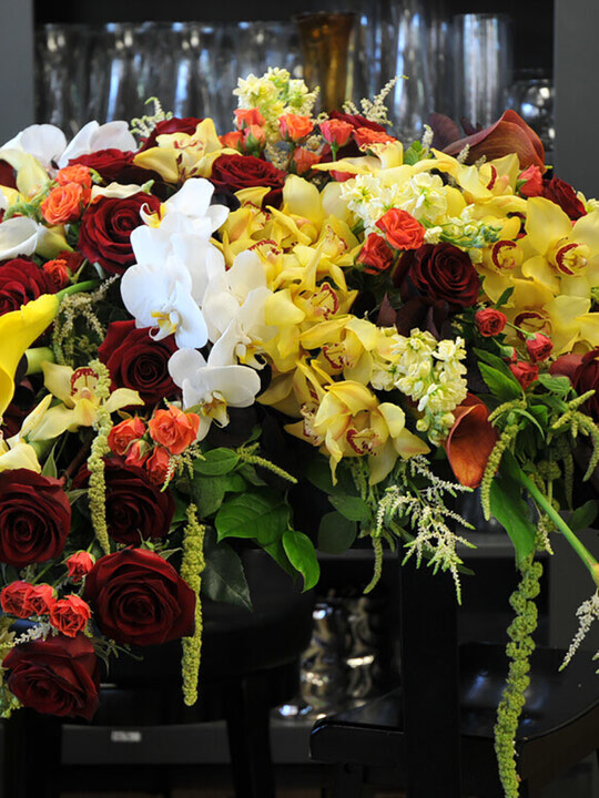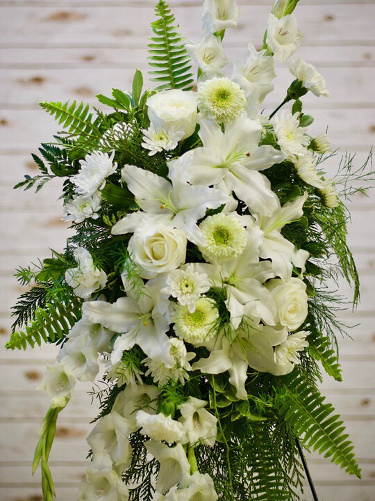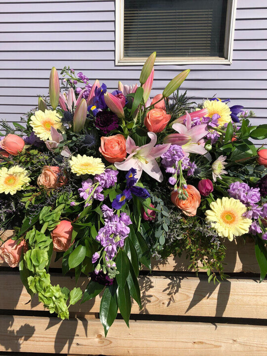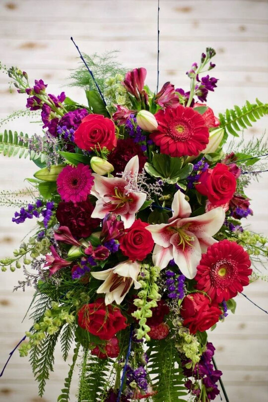 A large spray with lilies, roses, gerbera daisies, and seasonal flowers. We can change the colours depending on your preference and what we have for availability.