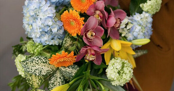 This stunning hand-tied bouquet is a cheerful celebration of colour, texture, and seasonal beauty.