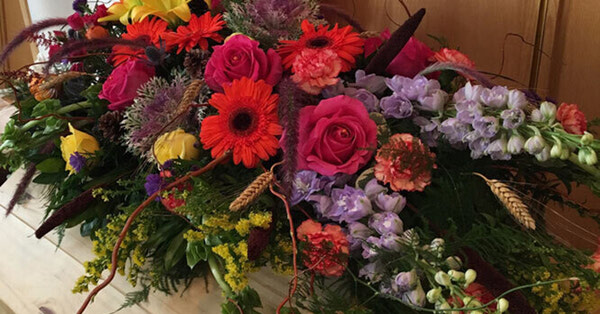 This casket spray speaks volumes about the person it pays tribute to. Colourful flowers and natural textures combine to create a big impression and are the perfect way to remember someone special.