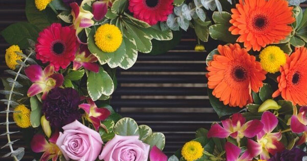 A beautiful colour blocked wreath. These bright colours would be a touching way to send your condolences and pay your respects to your loved ones