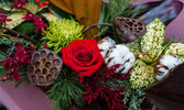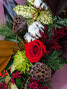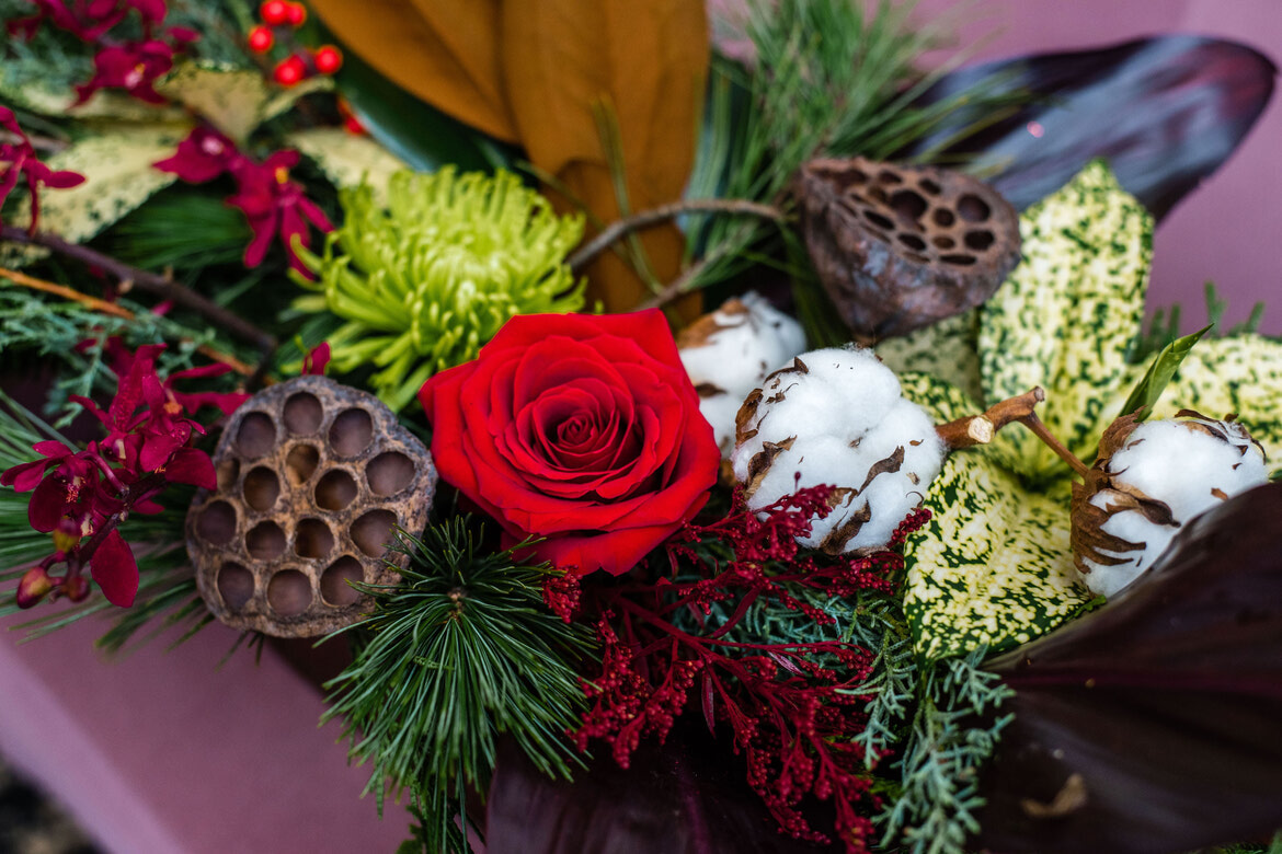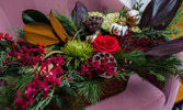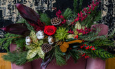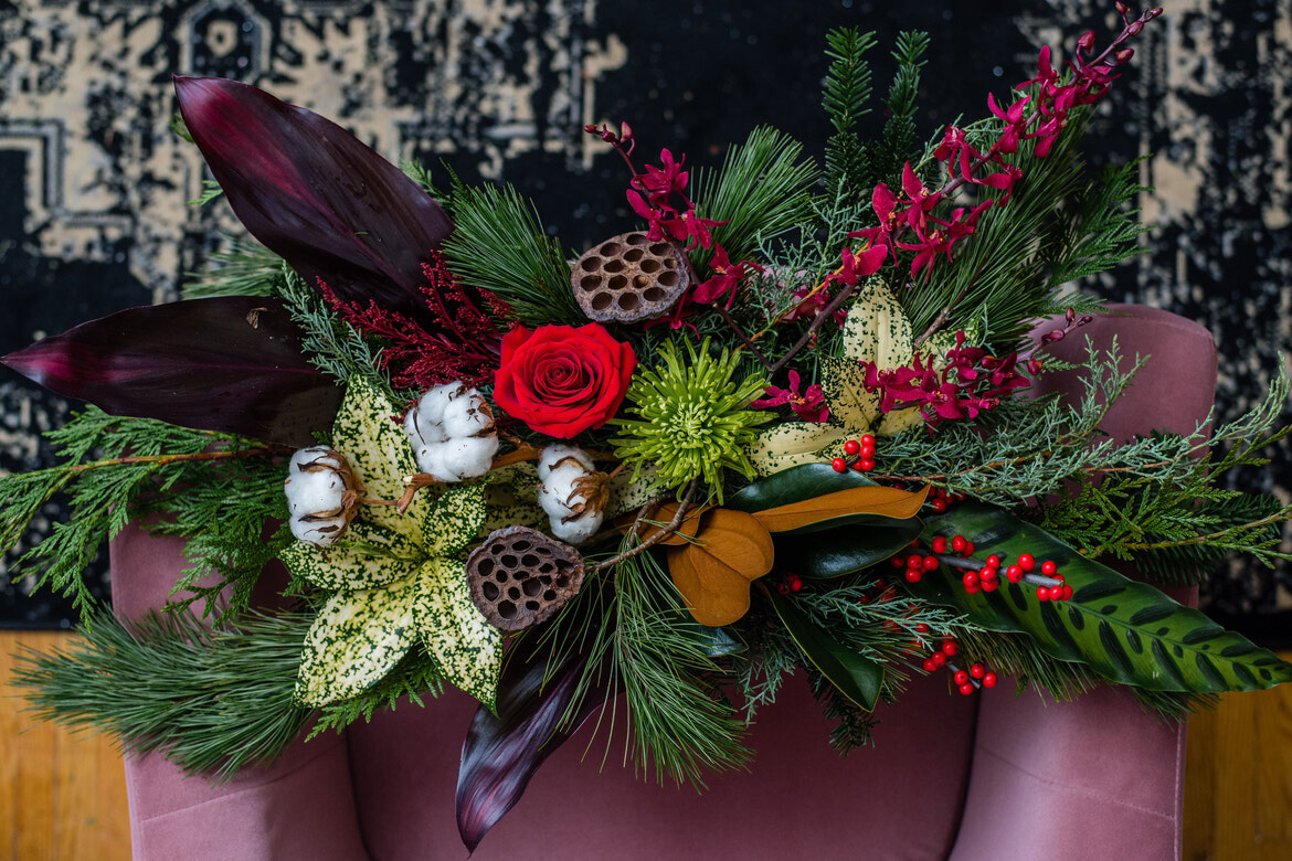 This gorgeous copper pot is filled with water and will last you through to the new year. Look at all of the textures and colours in this one. Your guests will be wowed by the wonderful smell and unique elements with tropical foliage and dried cotton stems.