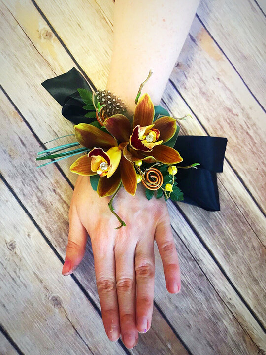This beautiful modern wrist corsage has a few more elaborate details to bring a fun feel to a gorgeous dress. This can be customized to match any colour. With it being built on ribbon, it can be secured on and a nice soft fit on the wrist.