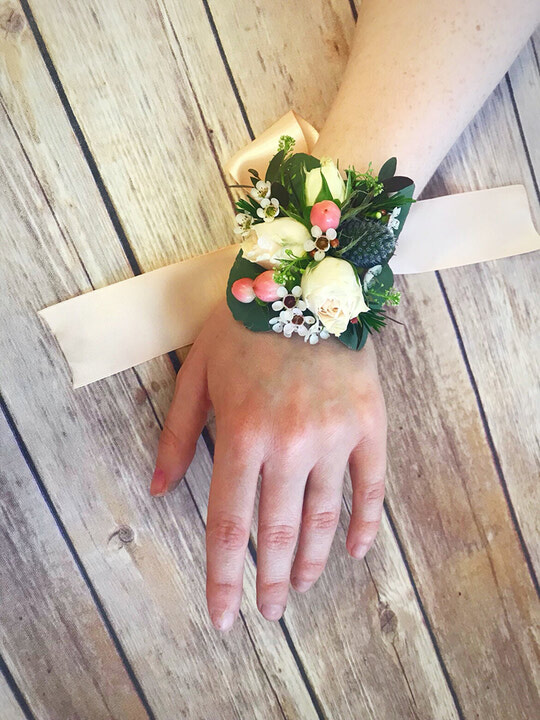 This hardy wrist corsage will last well through the day and evening. They also come in a large variety of colours.