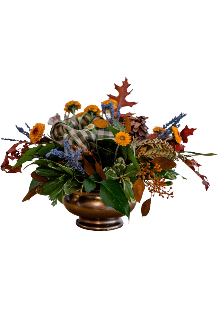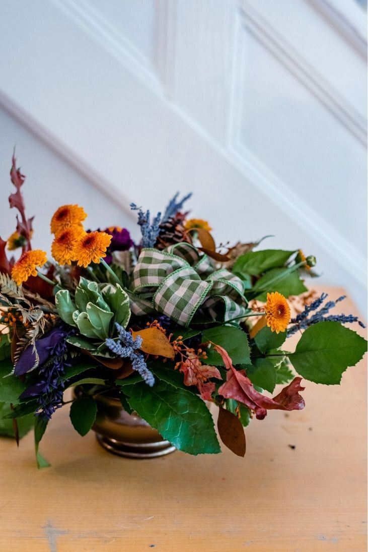 This cute little centrepiece features a rustic fall ribbon, pine cones, lavender, and mums! Extremely long lasting, and will make the perfect addition to a thanksgiving table.