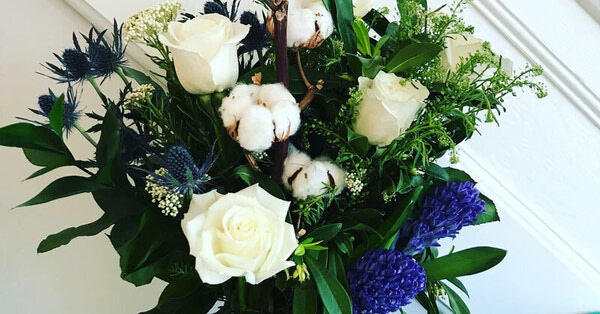 A serene blend of creamy white roses, rich blue accents, and airy cotton stems creates a bouquet that’s equal parts elegant and unexpected. Whether it’s displayed in a cozy home, a stylish office, or gifted to someone special.