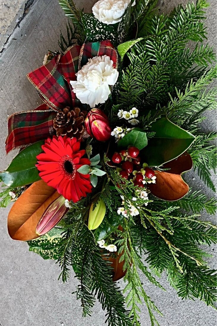 Cranberry colours make this centrepiece festive and bright. The suede magnolia leaves bring some great texture to this one.