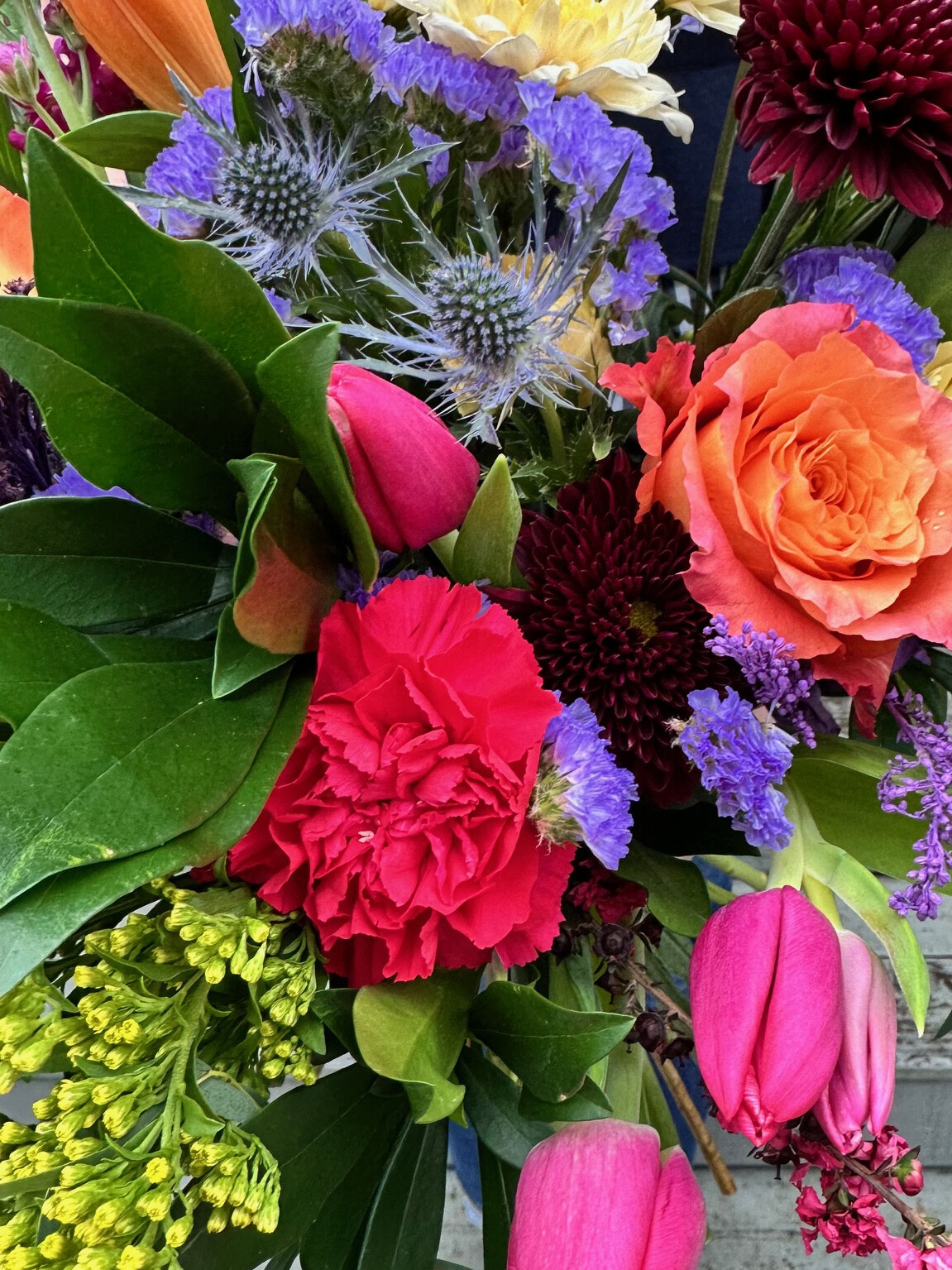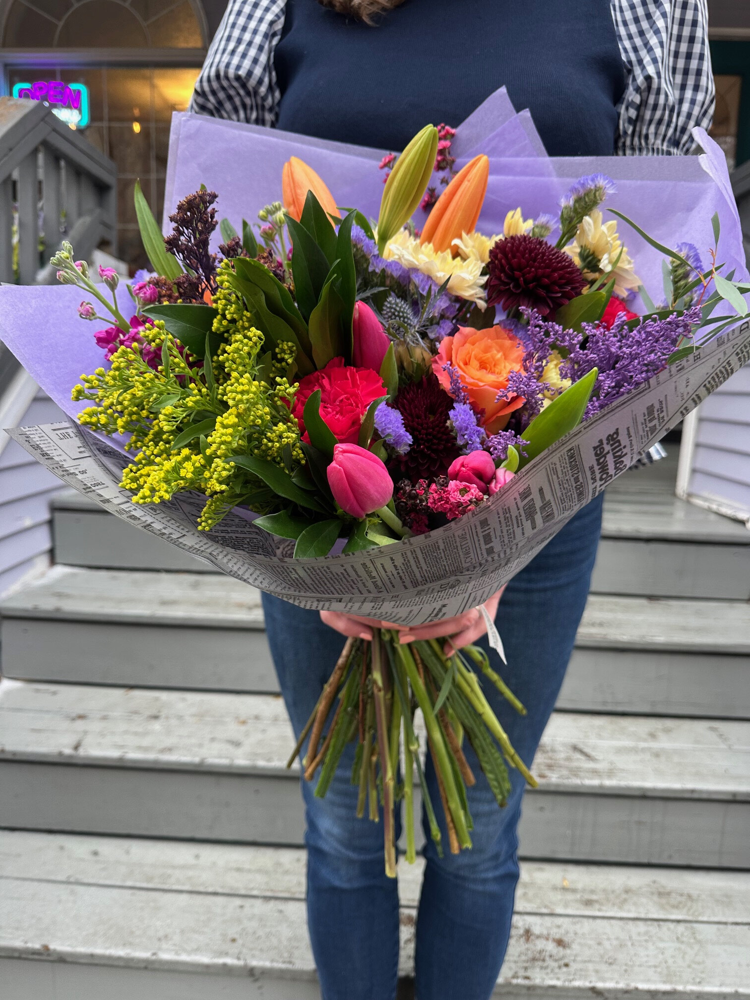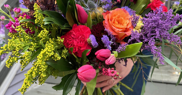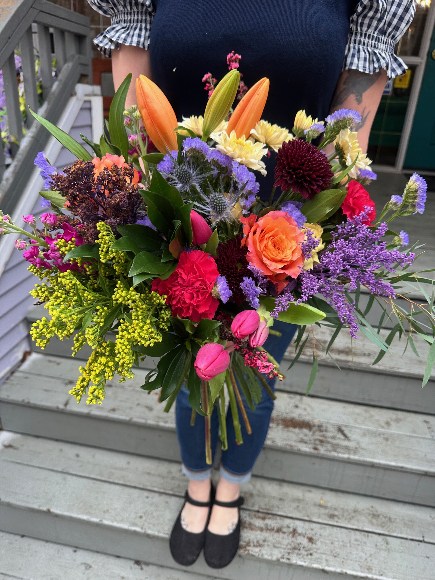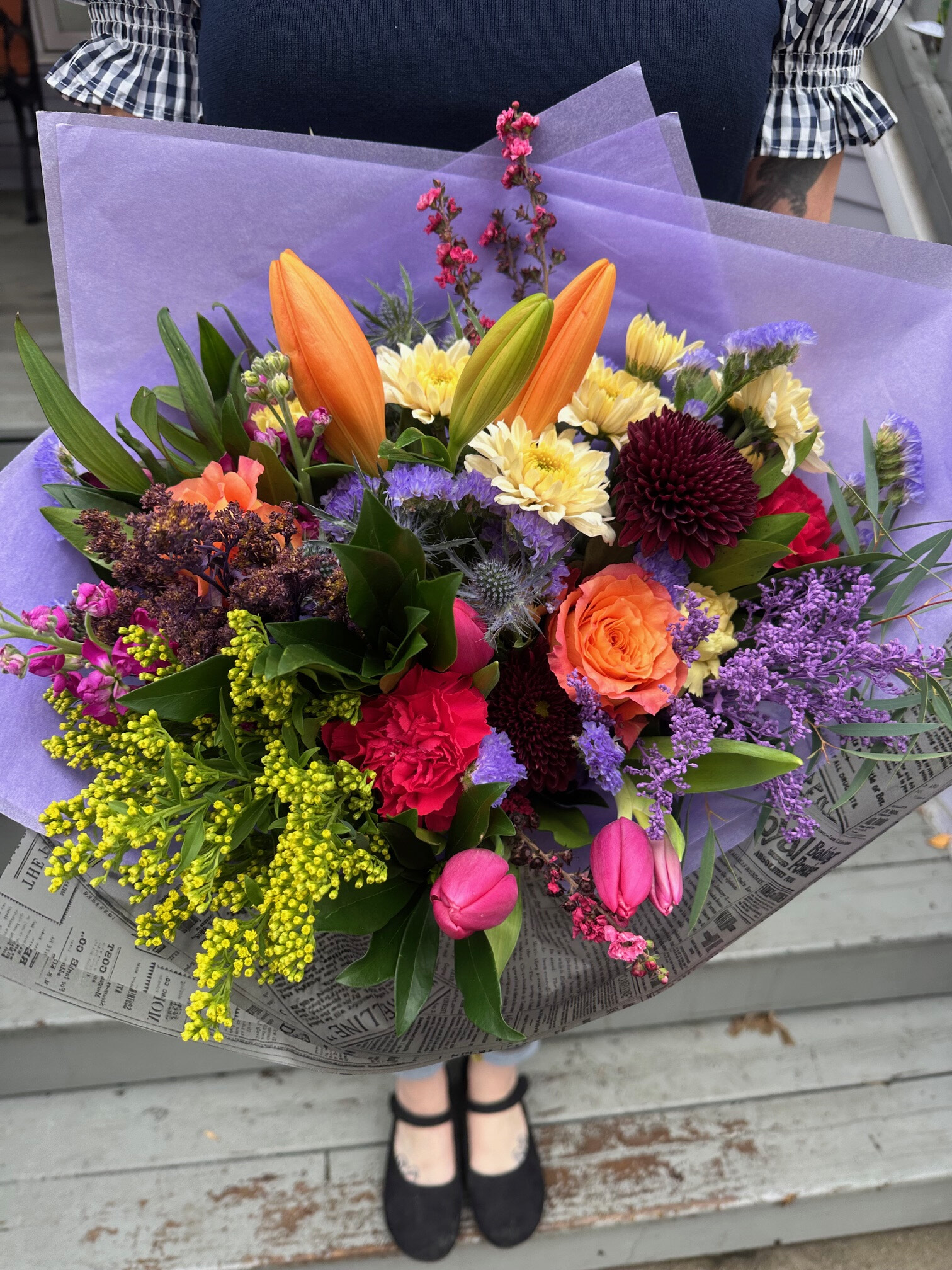 Crayons: A lovely mix of spring flowers in all of the bold crayon colours. This bouquet is a lovely collection of roses, and playful gerbera daisies, lilies, and complemented by playful spring flowers *seasonal* and greenery. It's a hand-held celebration, artfully designed to bring joy and a splash of vivacity to any space or occasion. *Hand-tied bouquet