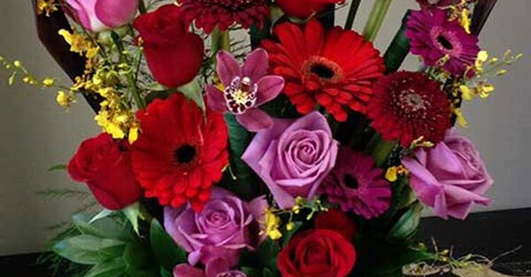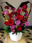 A wonderful arrangement of roses, orchids, and gerbera dasies. This arrangement is brought to life by a heart shape background!