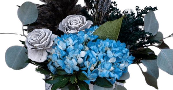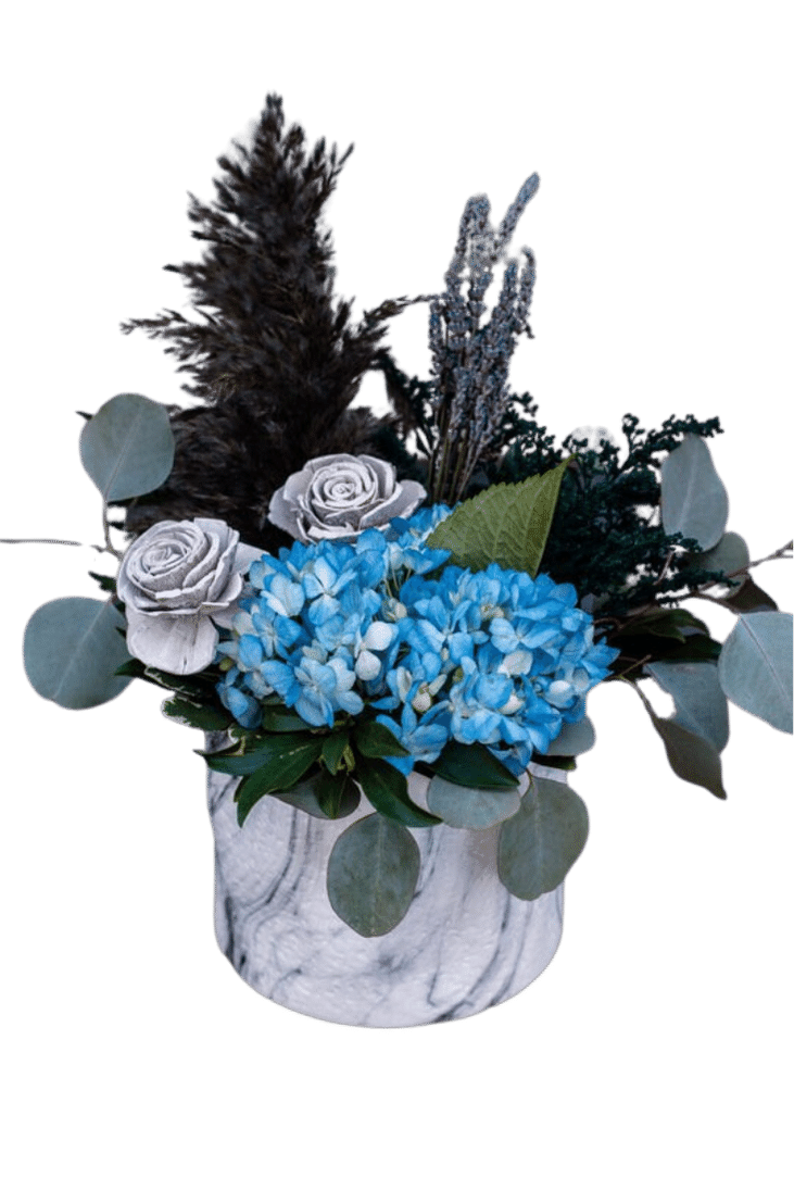 This sweet little mix of dried flowers and fresh flowers reminds us of Earl Grey Tea.
