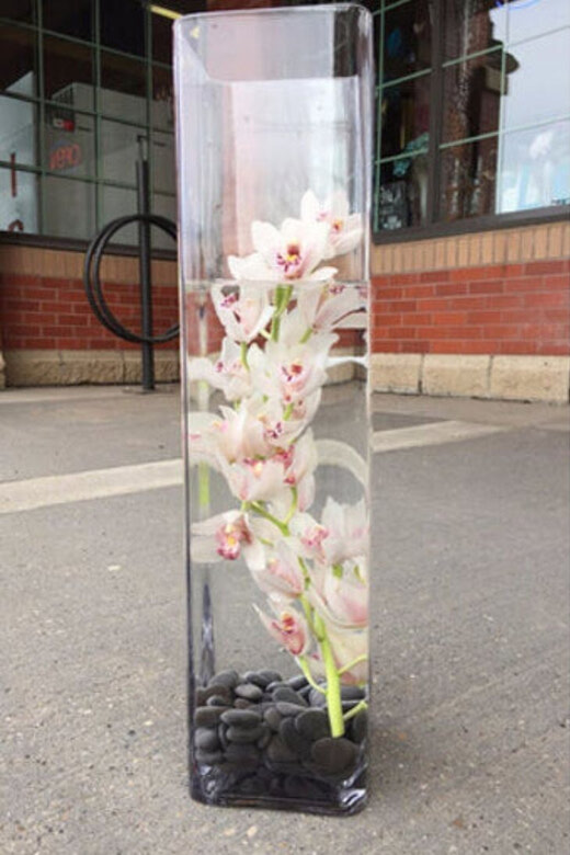 A mini cymbidium orchid in a tall underwater vase (15-24") gives a classy twist on our best-selling arrangement. Cymbidium orchids come in natural, soft tones of white, yellow, green, pinks, oranges, browns and burgundies (colours may vary seasonally).