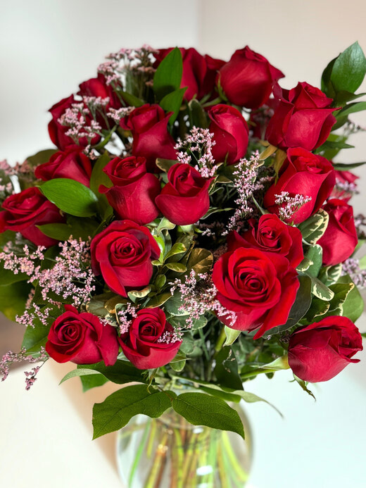 Elevate your expression of love with two dozen premium long-stemmed red roses artfully arranged in a classic glass vase, this bouquet exudes passion, elegance, and devotion. Perfect for anniversaries, Valentine's Day, or any special moment.