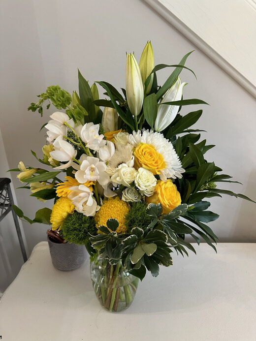 Yellow gerbera daisies, golden yellow roses, white chrysanthemums and casablanca lilies will make the statement that you would like to make. This is perfect to send to a home address or to the memorial service.