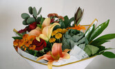 A bright and joyful mix of seasonal blooms in every shade! Hand-tied and wrapped, this bouquet is full of charm and colour, featuring lilies, gerberas, roses and mums A perfect pick-me-up or “just because” gift to bring beauty into any day.