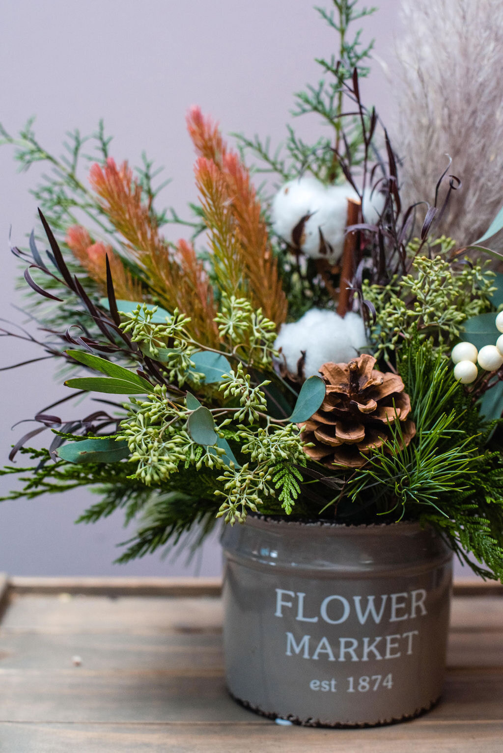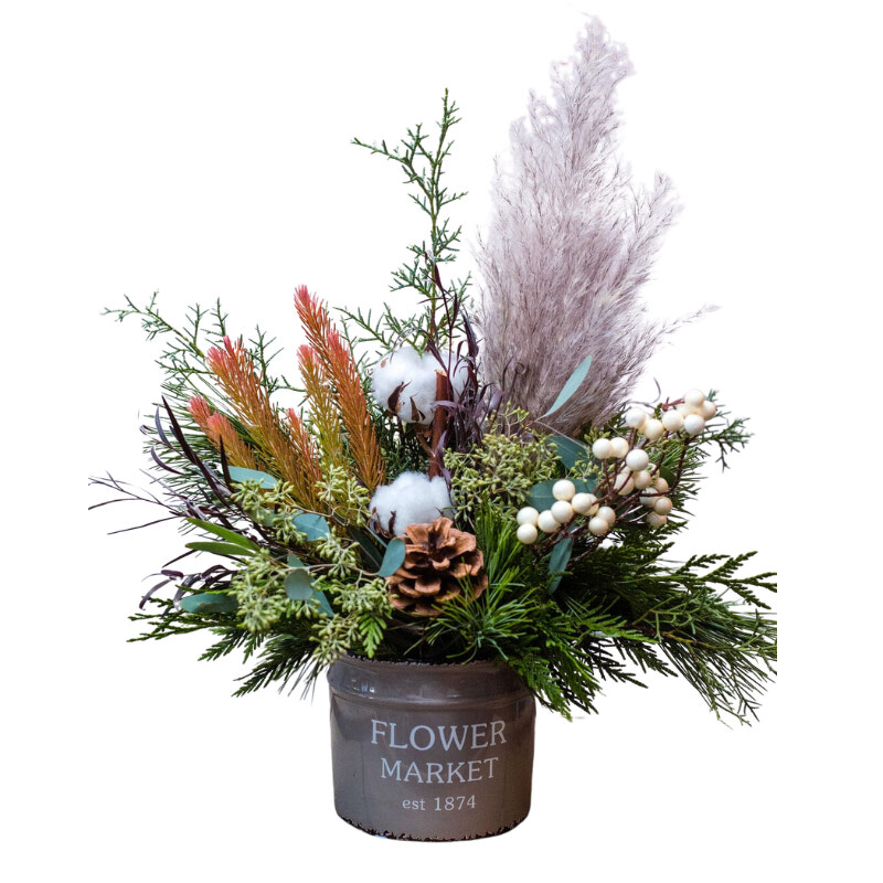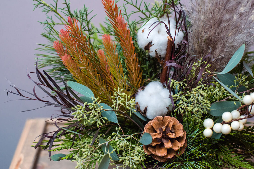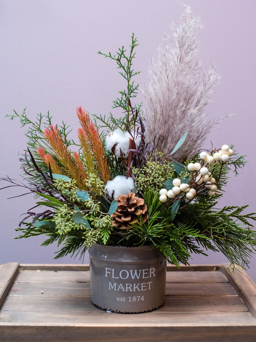 This gorgeous array of natural elements including cotton, pampas, evergreens, pine cones and eucalyptus will dry very similar to the arrangement.