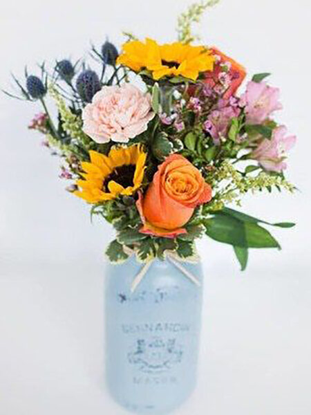 Please note that due to high volumes, this arrangement will look a little different. This hand-painted mason jar filled with fresh seasonal blooms is larger and has more unique blooms of fresh flowers. Flowers will be based on seasonal availability.