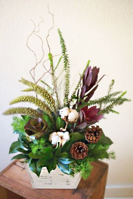 A touch of white stands out in this beautifully textured basket arrangement. The cedar smell reminds us of camping in the forest.