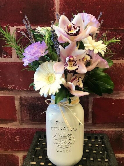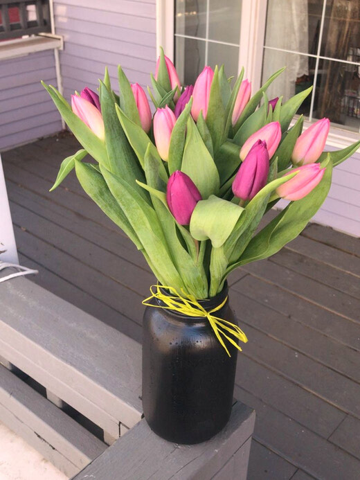 Tulips! A sweet mini jar with some tulips and fillers! Colours will vary, please specify colour choice if specific. Add $5 for painted jar.
