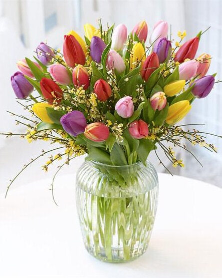 Brighten any space with the timeless beauty of fresh tulips! This large vase arrangement features a stunning selection of vibrant tulips, carefully arranged to create a cheerful and elegant display.