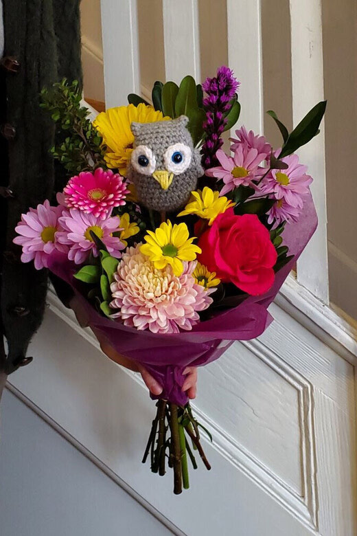These lovely wrapped bunches have a little hand-crocheted owl to complete the arrangement. Please specify the colour choices below.