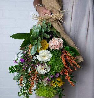 A unique take on floral design, this bundle-style bouquet is artfully arranged with lush greens, vibrant seasonal blooms, and textured foliage—all wrapped beautifully.